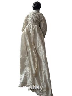 Molded bow on front of chest, hairline on side of neck see close up. Some stains on cotton antique long dress, smoke free home.