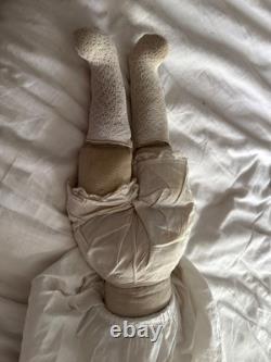This antique German china head doll is 22 inches tall and comes in an antique white work dress. The doll has black molded hair, a light complexion, and a soft body. Manufactured in 1900 in Germany, this vintage doll is a collectible piece perfect for adult collectors aged 17 years and up. Its original features and pre-1900 production make it a unique addition to any doll playset or collection.