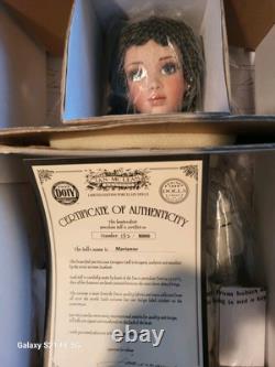 This beautiful porcelain doll, created by renowned artist Jan Mclean, is a rare vintage collectable that will make a stunning addition to any collection. The doll is 24 inches in length and features curly brown hair, blue eyes, and a light complexion. She comes dressed as Marianne, a character from the popular fairy tale, and is accompanied by a certificate of authenticity. This limited edition doll is a collector's edition and a special edition, making it a must-have for any serious collector. It was manufactured in 1999 and is in pristine condition. Don't miss out on the opportunity to own this exquisite piece of art.