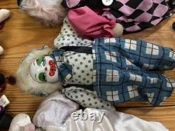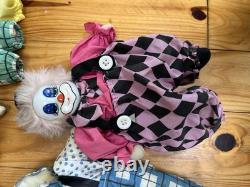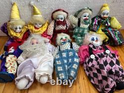 Lot de 9 poupées clowns en porcelaine vintage différentes. Ensemble de clowns jumeaux et clowns sur différents thèmes.